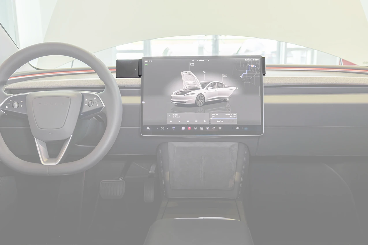 Hold the mount over the screen so the mounting plate is on the driver's side. Slowly and firmly, press down on both sides of the mount to slide/hook it onto the screen. Gently flex the sides out to ease the installation. Press downward until the mount is securely in place.
