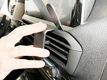 Press the thin end of the included gap opener into the gap between the frames surrounding the air vent and the dashboard, to widen the gap. Use the enclosed alcohol pad to clean the area where the mount will be installed. Peel off the adhesive tape cover. Press the angled edge on the upper part of the mount into the gap next to the gap opener. Pull out the gap opener.
