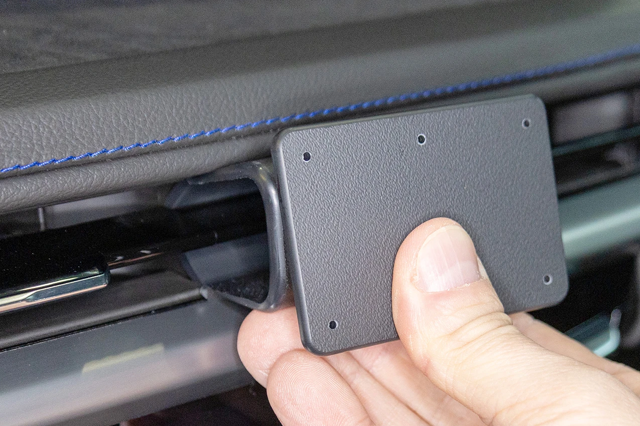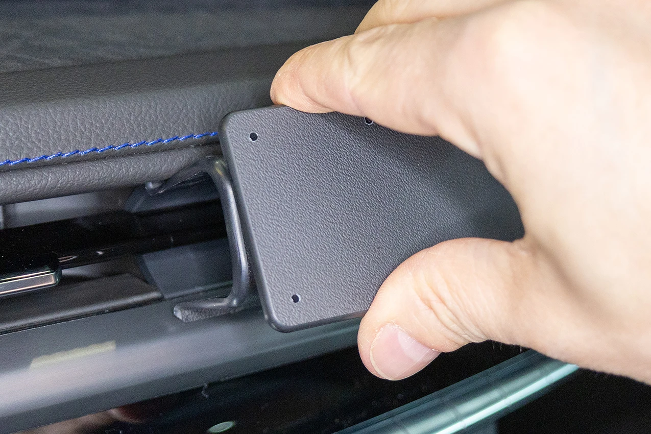 Use the enclosed alcohol pad to clean the area where the mount will be installed. Peel off the adhesive tape cover. Hold the mount so the faceplate angles toward the driver. Place the upper edge of the mount into the gap at the top of the center air vent divider.
