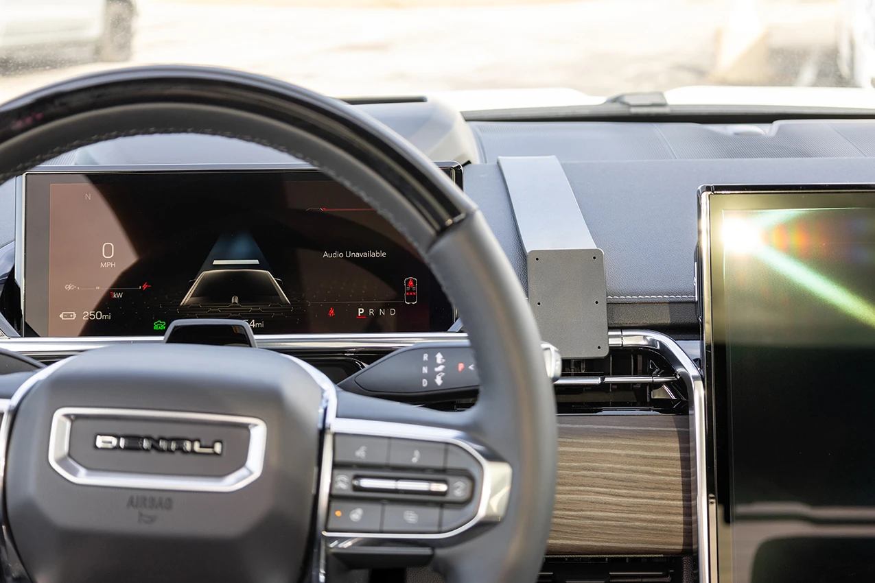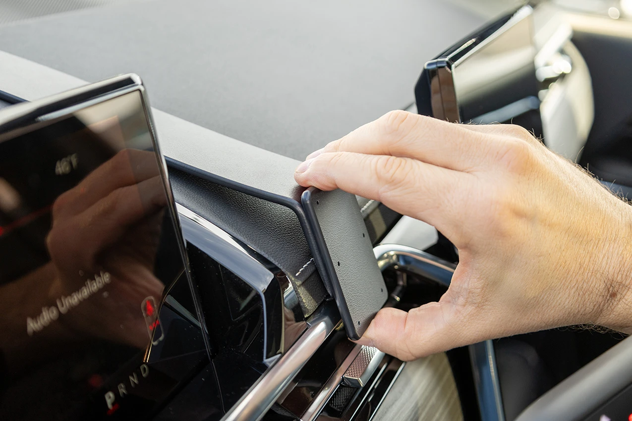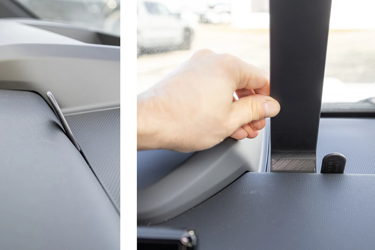 Insert the included gap opener into the gap behind the top dashboard section, as shown in the picture. Position the mount just right of the HUD moulding. Press the long part of the mount into the gap next to the gap opener. Pull out the gap opener.