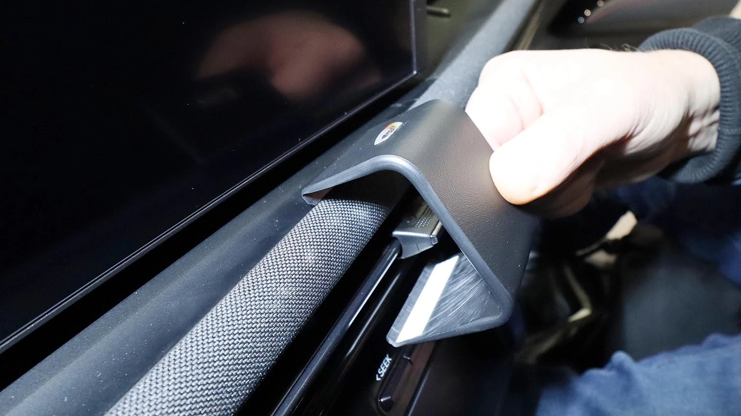 Press the thin end of the included gap opener into the gap between the trim and the center console, to widen the gap. Press forward on the lower part of the mount so the angled edge hooks behind the trim. Pull out the gap opener.