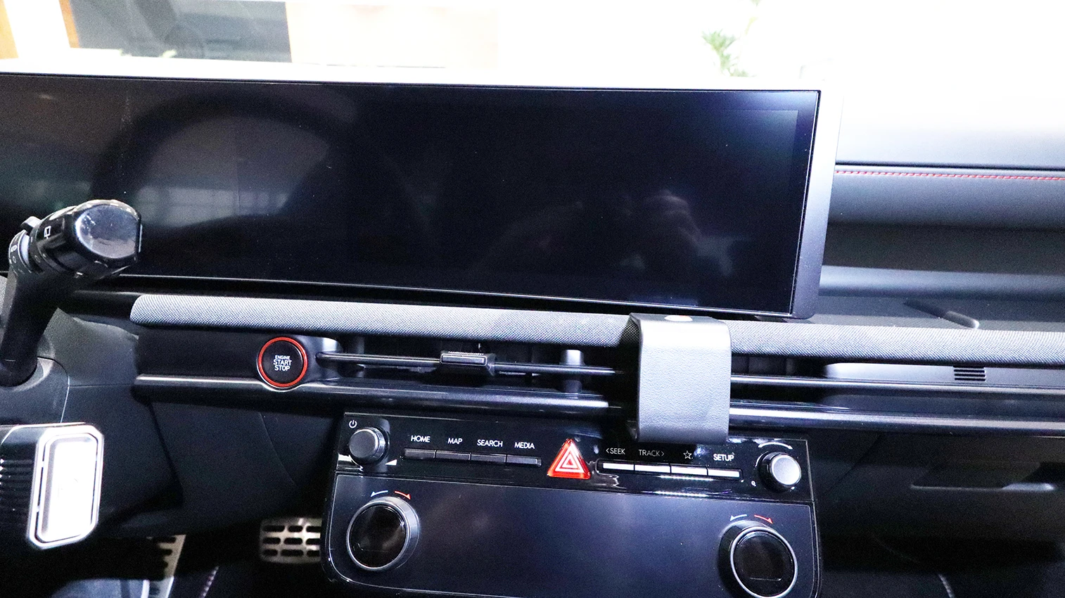 Use the enclosed alcohol pad to clean the area where the mount will be installed. Peel off the adhesive tape cover. Hook the upper part of the mount into the gap between the frame surrounding the screen and the padded trim.