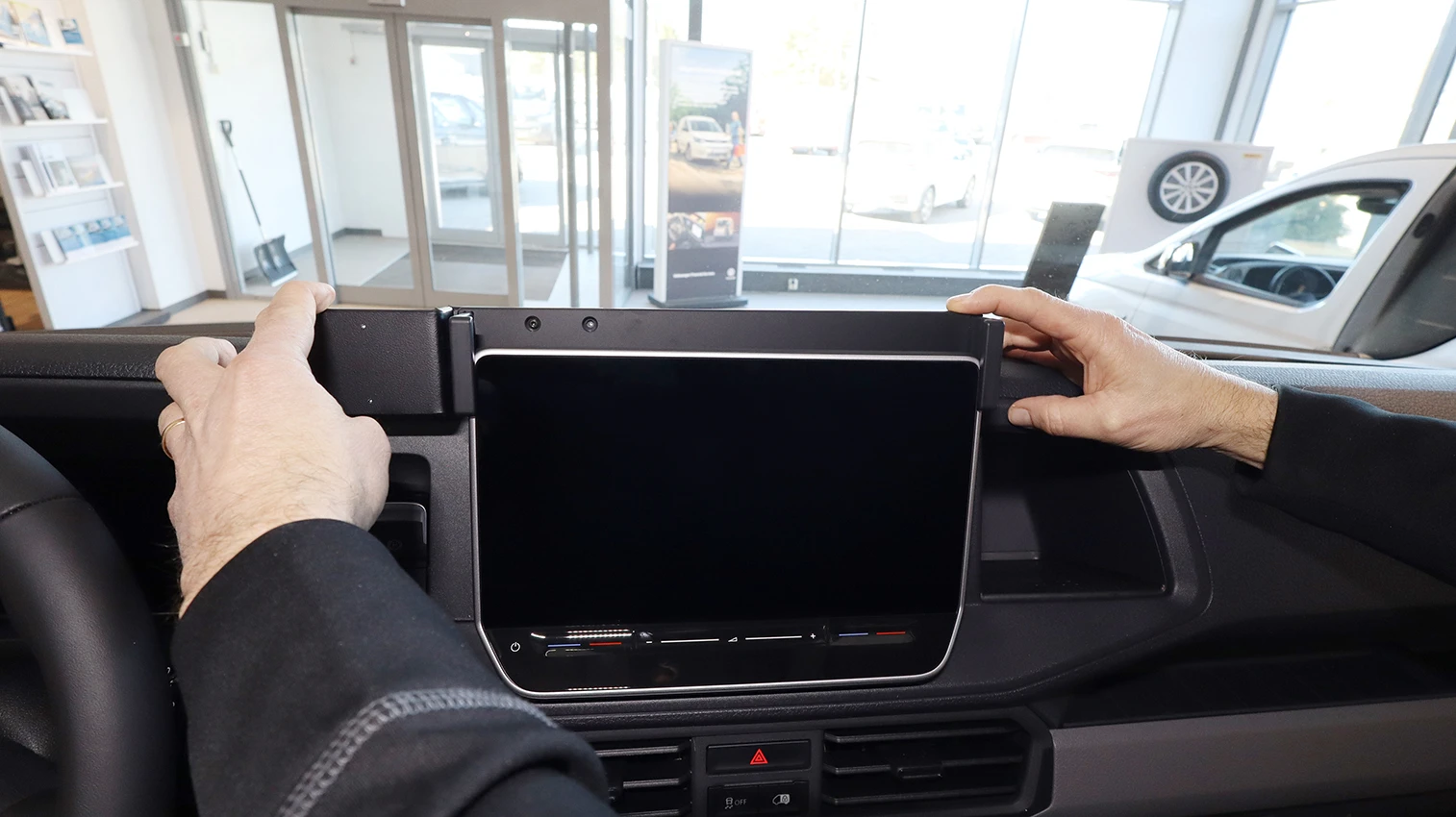 Hold the mount over the screen so the mounting plate is on the driver's side of the screen.