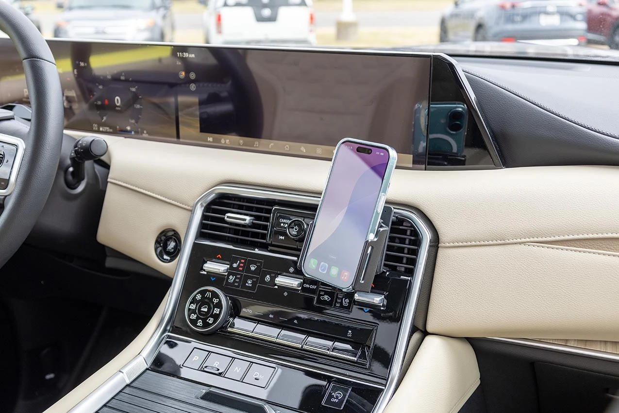 Press forward on the top of the mount until the upper edge snaps/clips onto the air vent frame. Make sure the lower edge is properly hooked behind the lower air vent frame.
