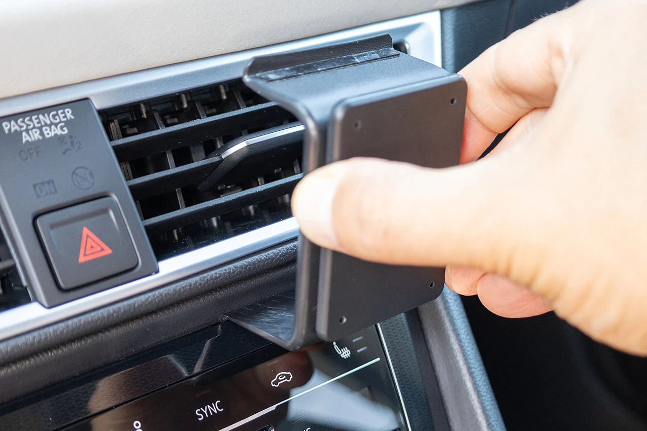Press down on the top of the mount and insert the upper lip into the seam between the air vent frame and the trim above.