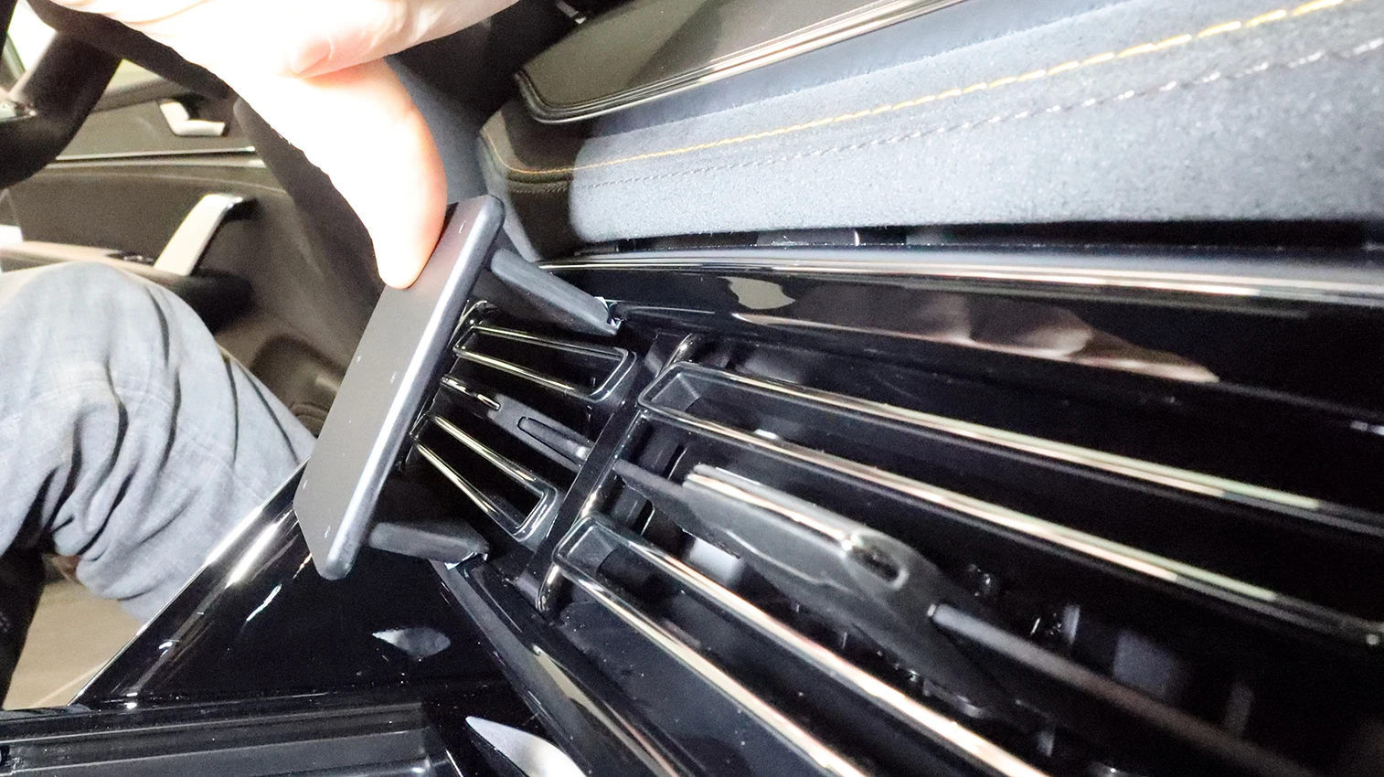 Press the mount upward and forward. Press forward on the upper part of the mount so the edge hooks under the frame surrounding the air vent.