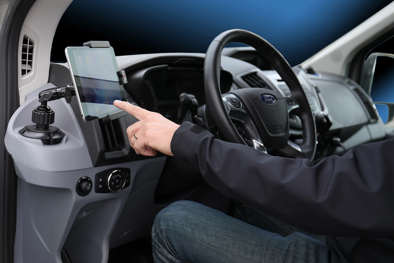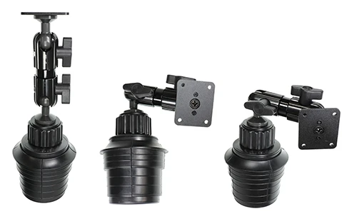 A Standard Duty Pedestal Mount for a stable installation in a cup holder. Easy to set in any angle and position thanks to ball heads which tilt 210° and swivel 360°. AMPS holes, compatible with all Brodit holders with tilt swivel. Color: Black. Rod made of aluminum, wingnuts made of plastic.