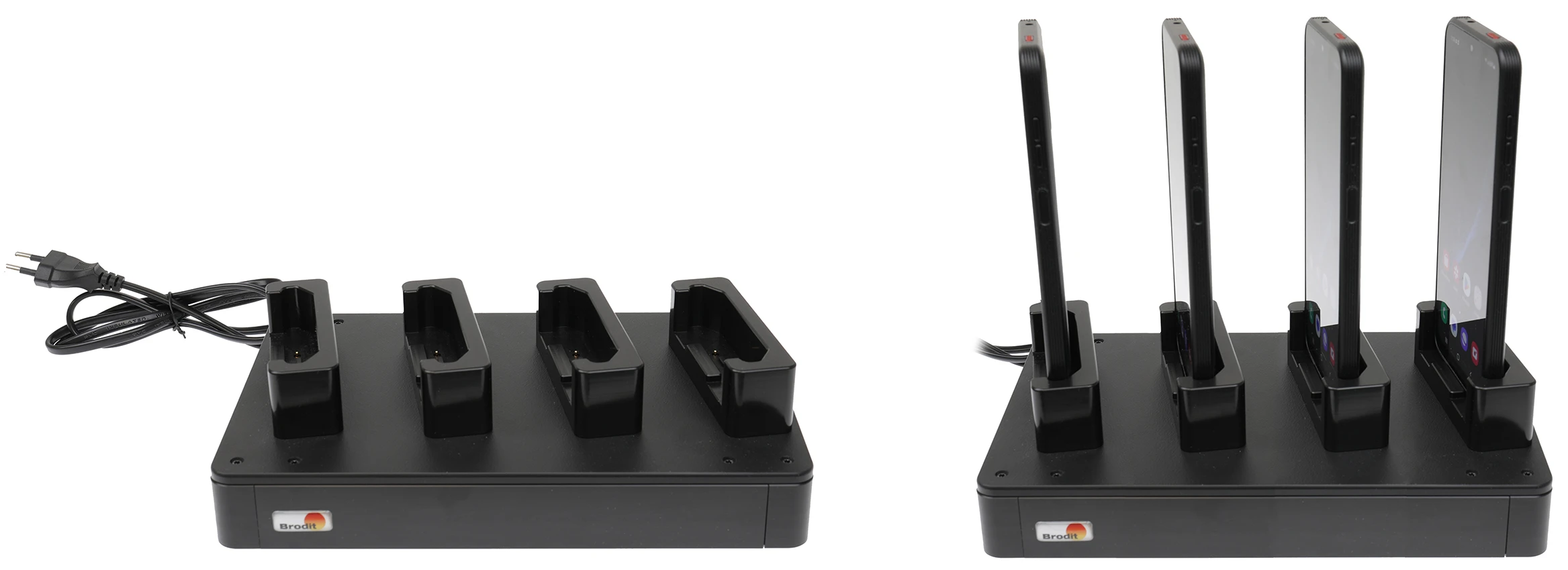 Brodit has developed a desktop charging dock for simultanious charging of four phones. The charging dock is used by haulage contractors, warehouses, schools and offices, as well as within health care, police and civil protection; everywhere where the device are used in daily operation. The desktop charging dock can handle up to fore devices simultaneously, it takes up minimum space and if using many phones, several charging docks can be neatly placed next to each other.