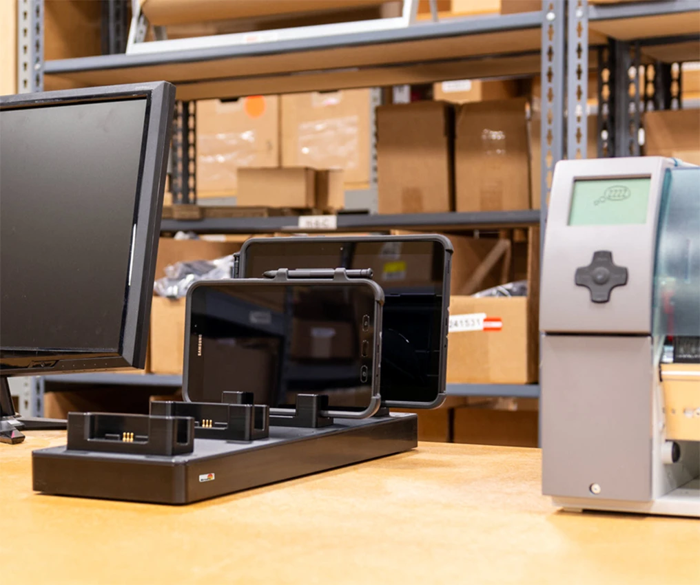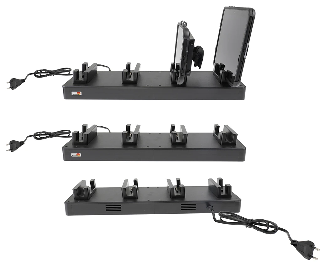 Charging station with 4 slots. Fits both Samsung Galaxy Tab Active 2 and Galaxy Tab Active Pro simultaneously. Designed for OtterBox uniVERSE tablet cases, works with or without the OtterBox uniVERSE hand strap. One-handed insertion and removal of tablets. Made with high-quality ABS and Acetal polymers. Color: black. Designed and manufactured in Sweden