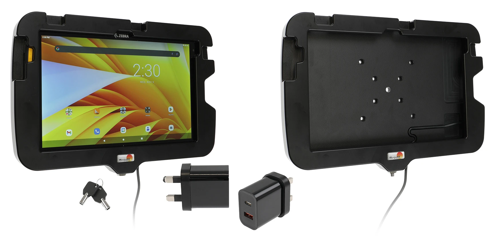 This holder is to be used when you want to secure your tablet and still have it easy accessable. The holder is also perfect for use in stores, at exhibitions and any place where you want to use your tablet without having it easy removable. The holder is made of extra strong plastic and is equipped with a lock. In order to remove the tablet from the holder you need the key, two keys are included. The holder also includes a power cable and a wall adapter to keep the device always charged and ready for a new work shift.