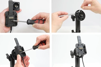 To place the device in the sleeve: Place the device onto the backpart of the sleeve. Carefully connect the charging connector to the device. NOTE: It is very important to hold the connector straight in front of the device and connect it straight into the device (if you angle the connector/place it askew into the device, you risk to damage the connector/device). Place the front part/frame over the device and attach it by screwing the enclosed screws into place on the back side of the sleeve. Place the short screw in the position shown in the picture and the long screws into the other predrilled holes. The device is now securely in place and can not be removed without loosening the screws. 2. To install the active MultiMoveClip: Loosen the screw in the center of the Power Block so you can remove the tilt swivel attaching plate on the back. Place the attaching plate onto the desired position and screw it into place with the enclosed screws. Place the Power Block over the attaching plate so the screw fits in the hole in the tilt swivel. Tighten the screw until the MultiMoveClip is firmly in place, but still can be adjusted. 3. To place the sleeve onto the active MultiMoveClip: Place the sleeve above the Power Block and slide/press it straight downward into the Power Block so you hear/feel it snaps into place. The device is now connected to the charging. To remove the sleeve from the active MultiMoveClip: Press forward on the release arm on the Power Block so the sleeve is set free. Press/lift the sleeve straight upward, out from the Power Block. 4. The product is in place.