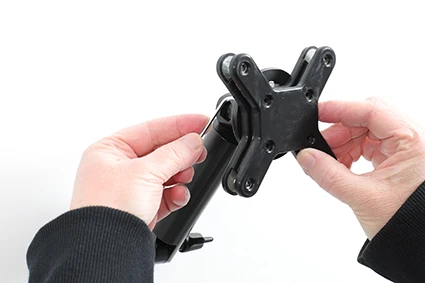 Mount the Vibration dampener onto a holder without tilt swivel: Place the holder onto the desired position and screw into place, for mounting surface ≤ 3mm thick use the short screw.